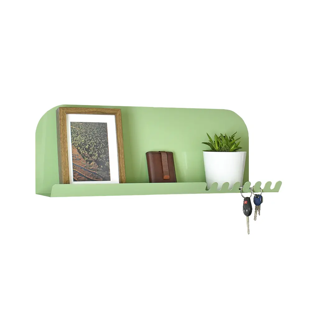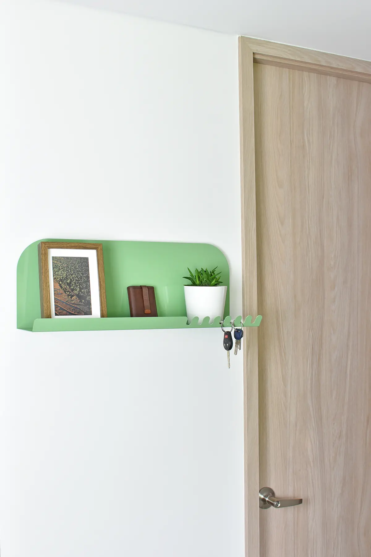 El Recibidor Comte es la versión larga del Recibidor Auguste, cuenta con amplia una superficie plana de 59 x 14 cm que hace la función de repisa, donde puedes colocar multiples objetos decorativos que reflejen tu personalidad como fotos en portaretratos, plantas y souvenirs, aparte de otros objetos personales de uso frecuente. Al estar hecho en lámina metálica no solo garantiza durabilidad, sino que también aporta un aire contemporáneo que complementa cualquier estilo de decoración. Este recibidor se convierte en una pieza central en tu entrada, capturando la atención de tus invitados desde el primer momento.